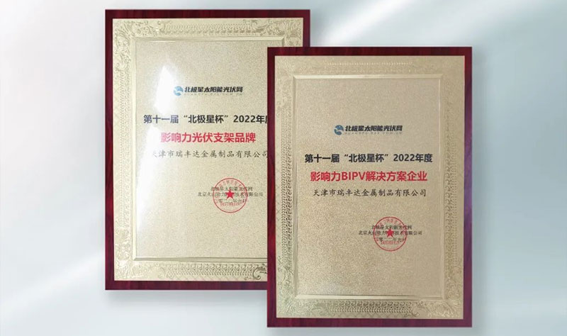 天津市瑞豐達(dá)金屬制品有限公司如約參加本次慶典,公司憑借優(yōu)秀的產(chǎn)品質(zhì)量以及一流的服務(wù)品質(zhì)榮獲“北極星杯”2022年度影響力光伏支架品牌和“北極星杯”2022年度影響力BIPV解決方案企業(yè)兩項(xiàng)大獎(jiǎng)。本次獎(jiǎng)項(xiàng)獲得,表明了瑞豐達(dá)擁有過(guò)硬的產(chǎn)品質(zhì)量以及良好的業(yè)界口碑,同時(shí)也肯定了瑞豐達(dá)作為一家新能源企業(yè),“始終致力于發(fā)展光伏發(fā)電新能源領(lǐng)域,為發(fā)展綠色社會(huì)做出貢獻(xiàn)”的企業(yè)愿景。