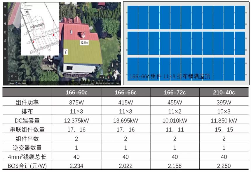 166的60c、66c組件可實(shí)現(xiàn)豎裝11×3排布,166-72c組件無法排滿3排,210-40c組件則只能排10列(10×3)。這種情況下,166-66c組件的總安裝容量最高,對應(yīng)的BOS成本也就最節(jié)省。