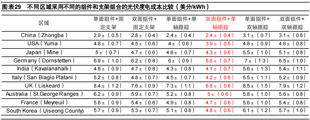 采用跟蹤支架雖然會增加初始投資和運維成本,但由于具有明顯的發電增益,能夠實現更低的度電成本。據統計,2021上半年,采用跟蹤支架系統的光伏電站項目的全球平均度電成本約38美元/MWh,明顯低于固定支架光伏項目。