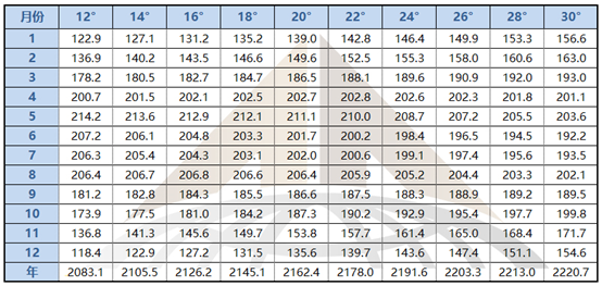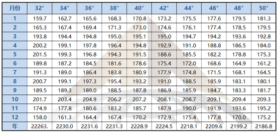表1列出了0°到50°各月份傾斜面上的輻射量(kWh/m2)。